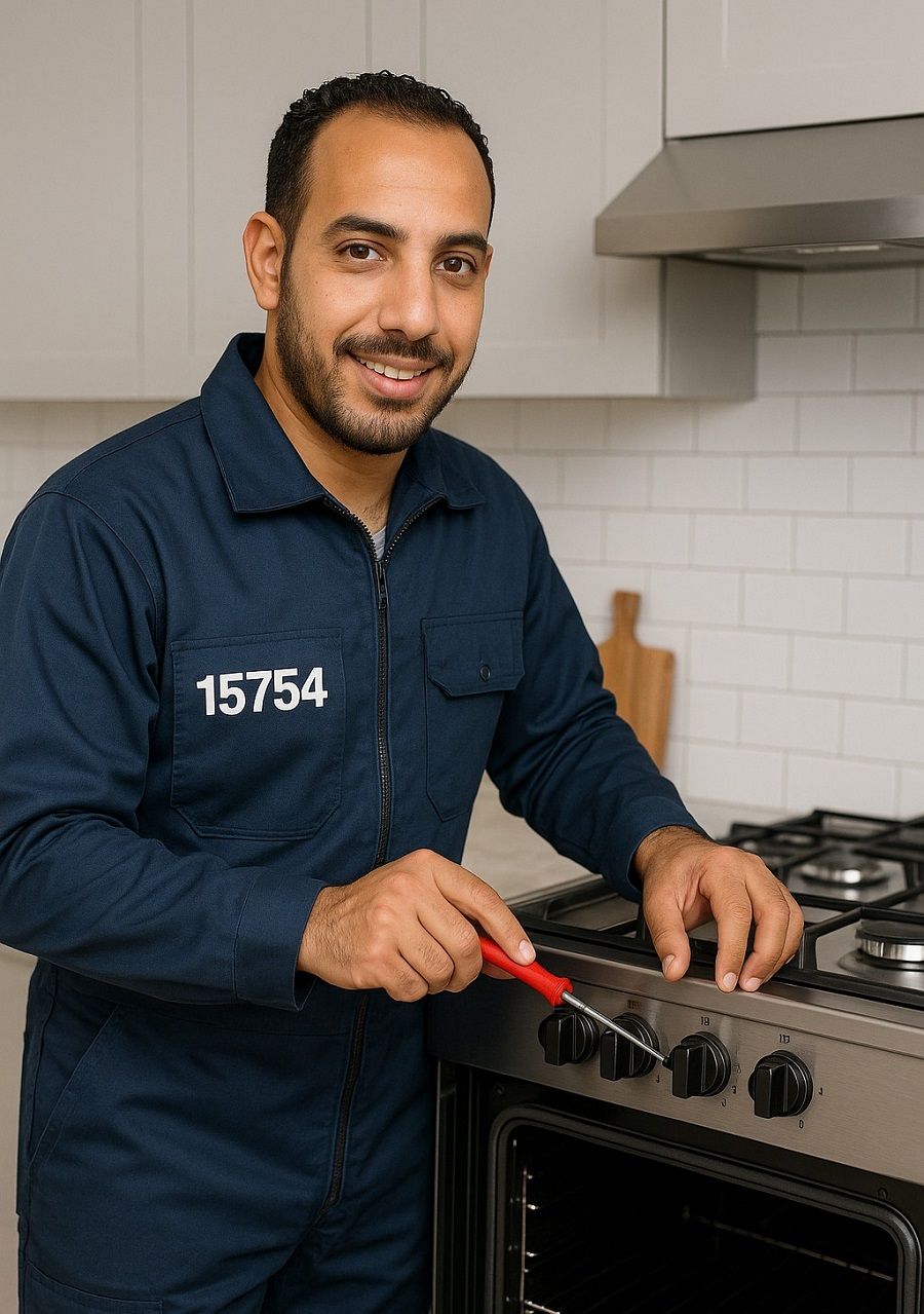 • تأكد من أن الجهاز قابل للوصول بأمان: قم بإخلاء المنطقة المحيطة بالفرن أو البوتاجاز من الأدوات والأغراض. هذا يسمح للفني بالعمل بسهولة وأمان ويمنع أي أضرار عرضية للأشياء الخاصة بك.